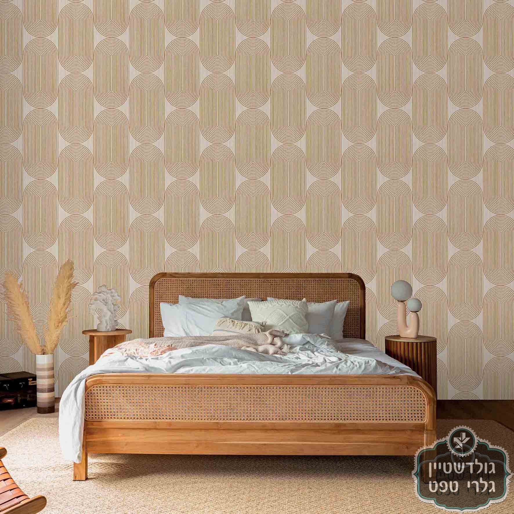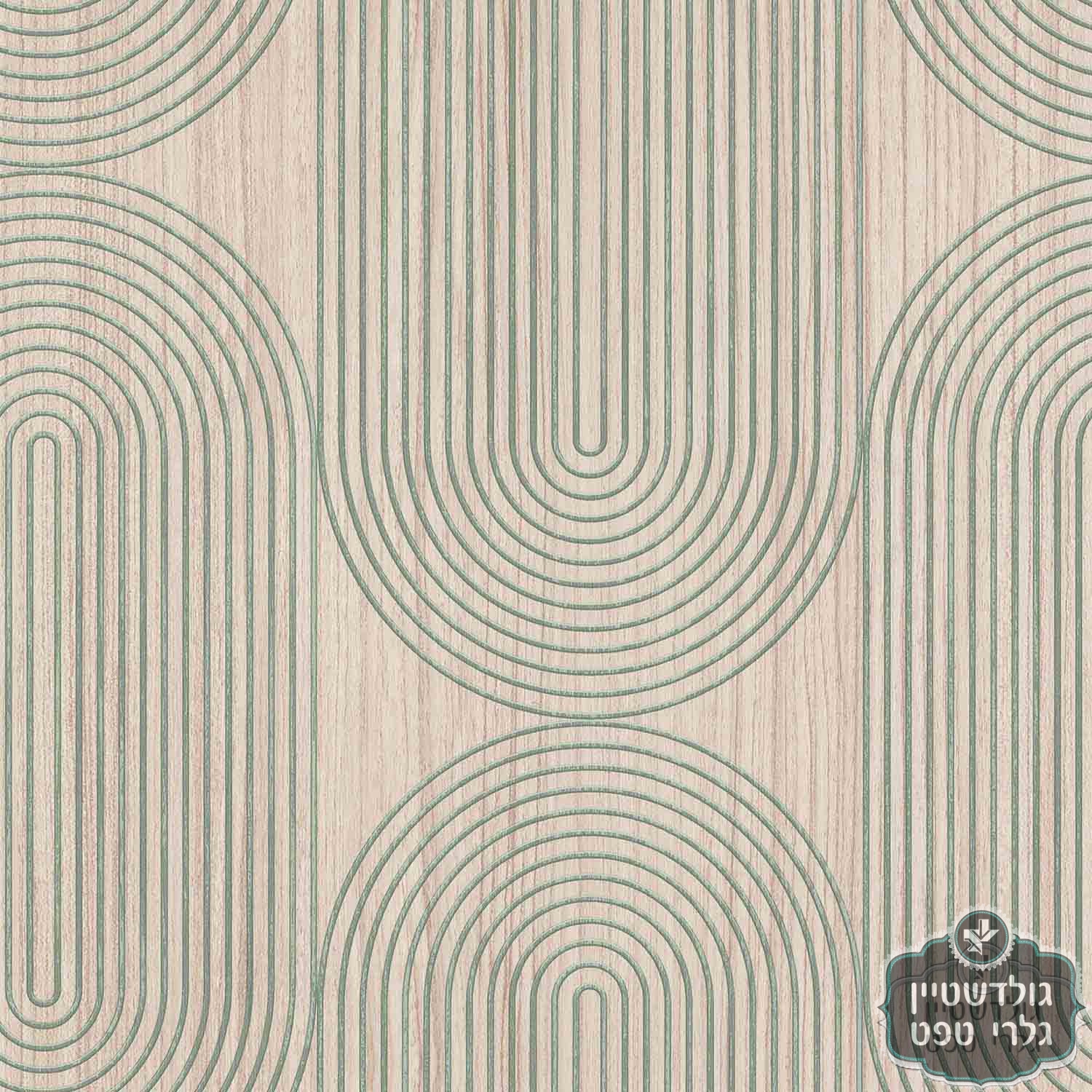 טפט גאומטרי, אליפסות גוון טורקיז על רקע דמוי עץ בגוון עץ אלון בהיר