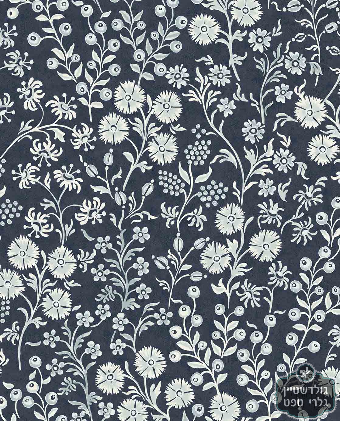 טפט הדפסי פרחים עשירים, לבן תכלת על רקע כחול כהה