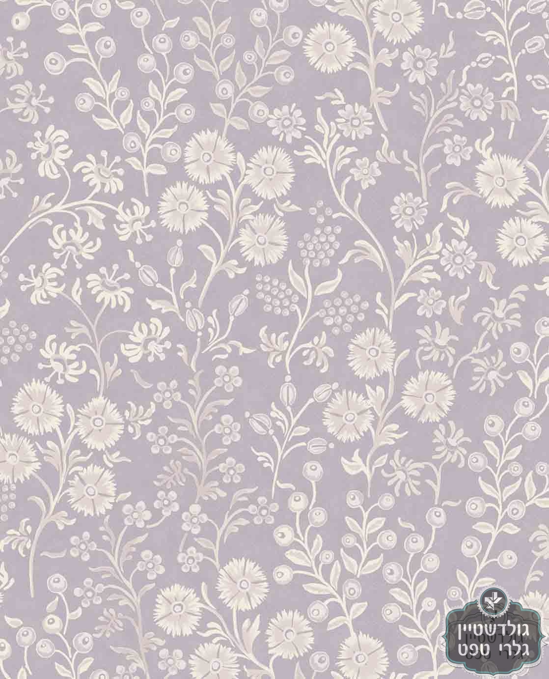 טפט הדפסי  פרחים עשירים, שמנת על רקע סגול, טקסטורה עדינה
