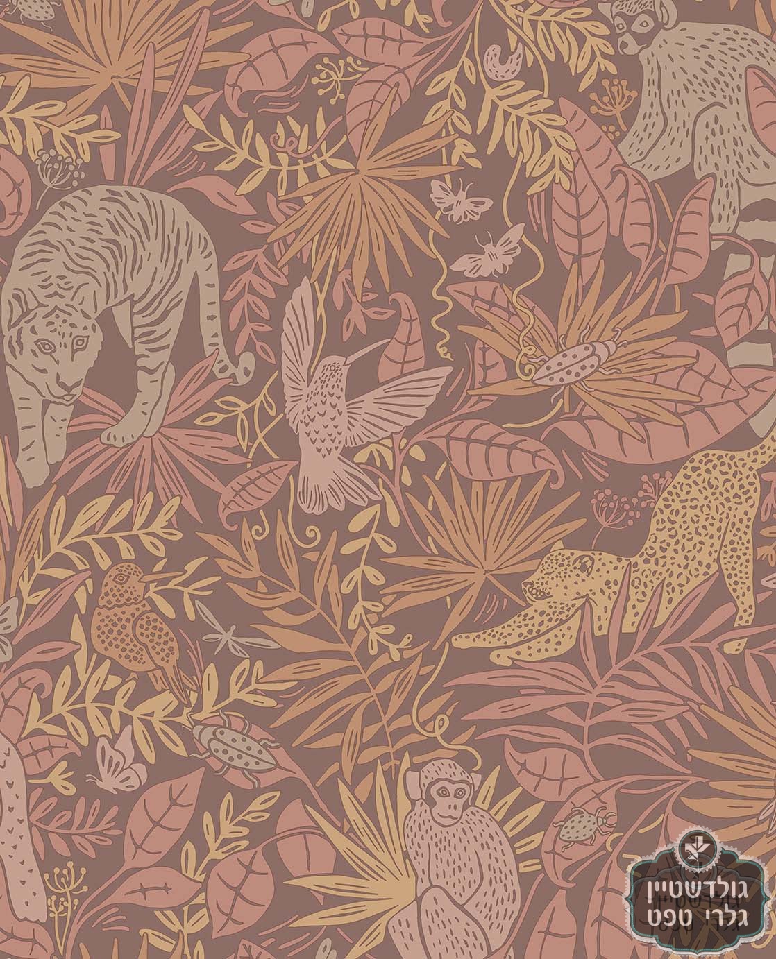 טפט חיות, נמר, קוף, למור, ציפור, חיפושית, גחלילית, פרפר, על רקע חום אדמה