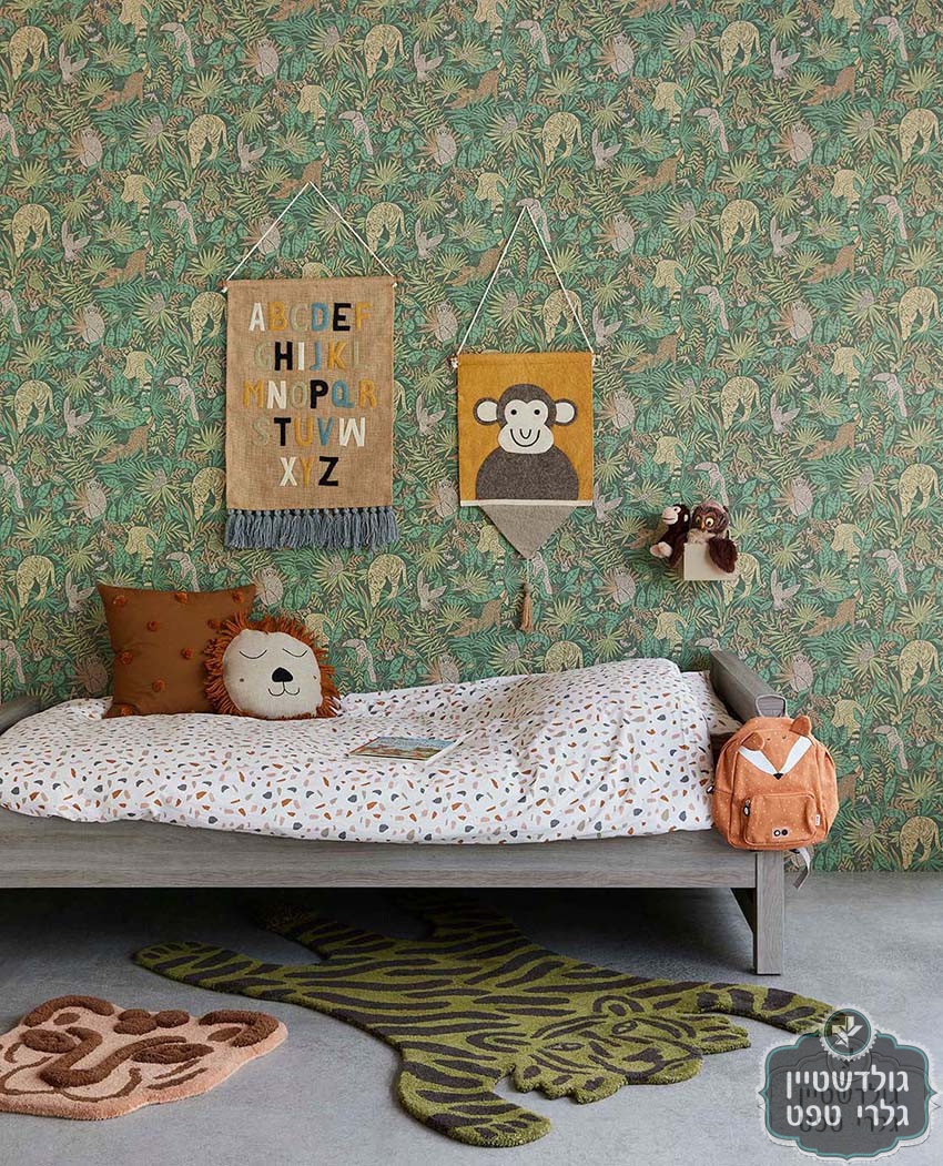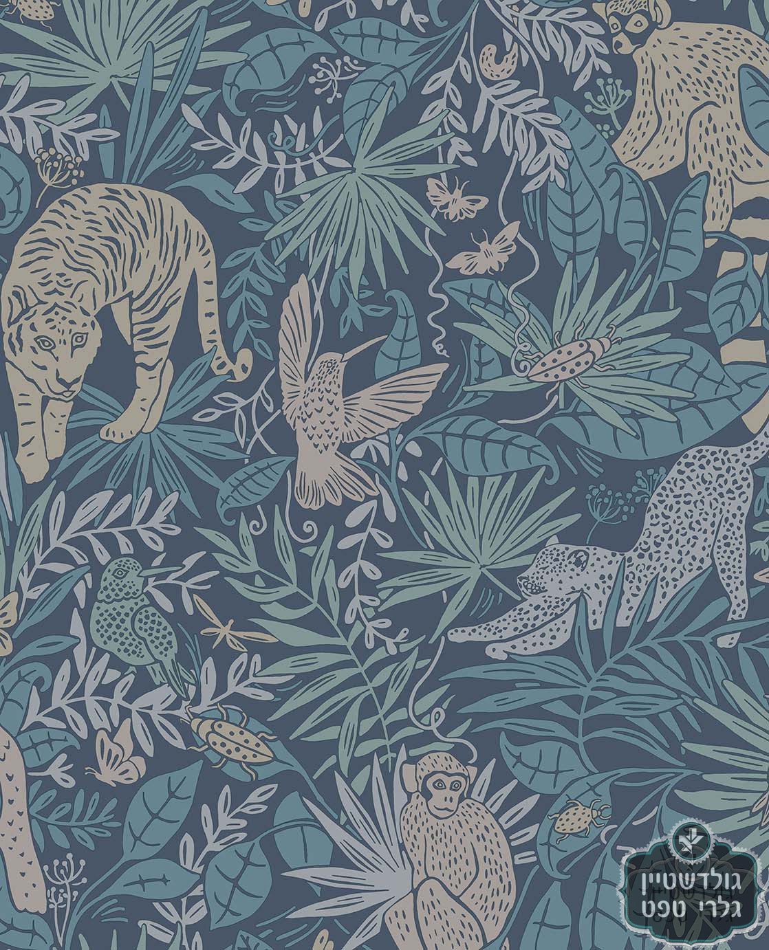 *טפט חיות ועלים טרופי על רקע כחול מעושן