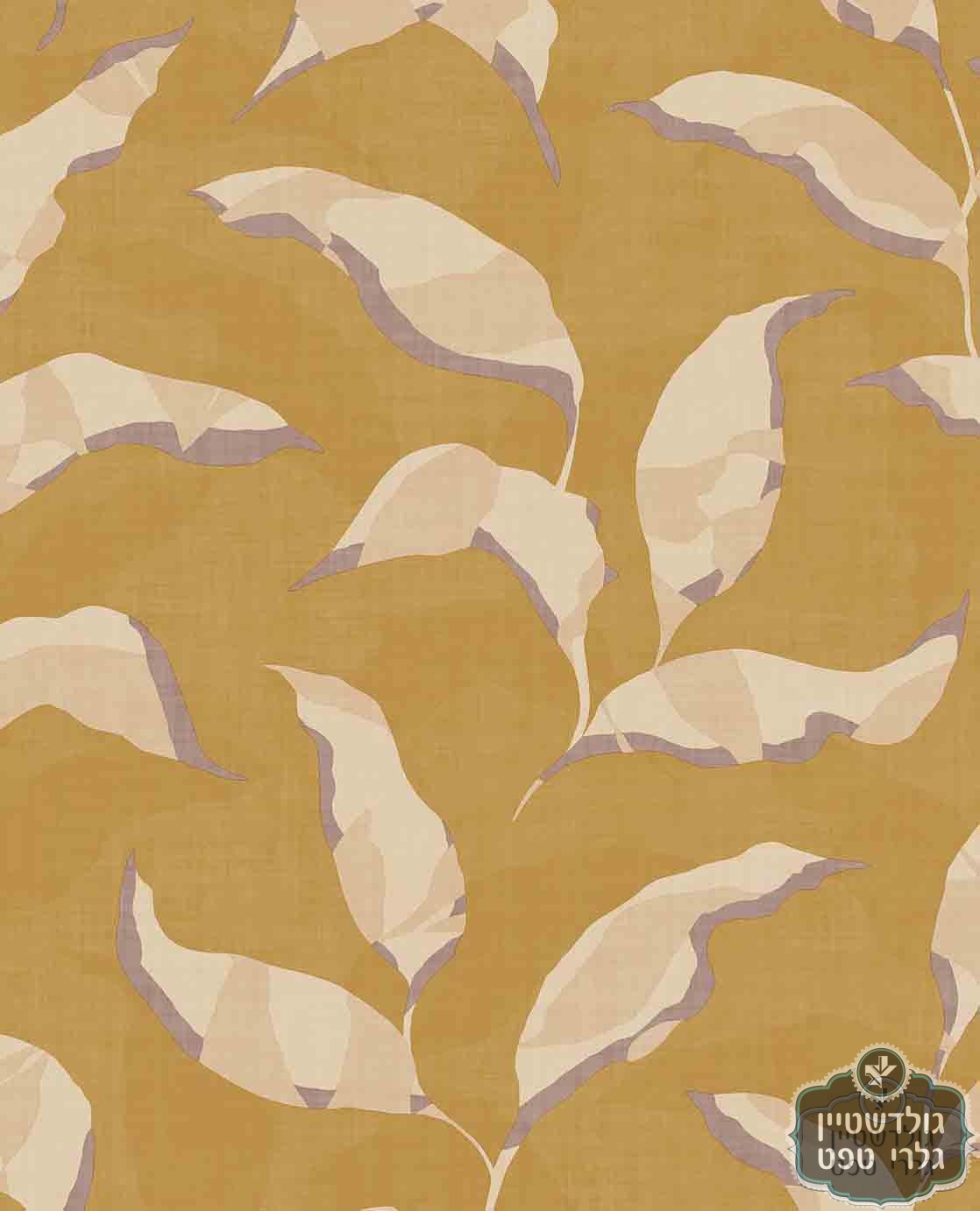 טפט עלים אבסטרקט, סגול קרם שמנת על רקע צהוב חרדל, אוקר