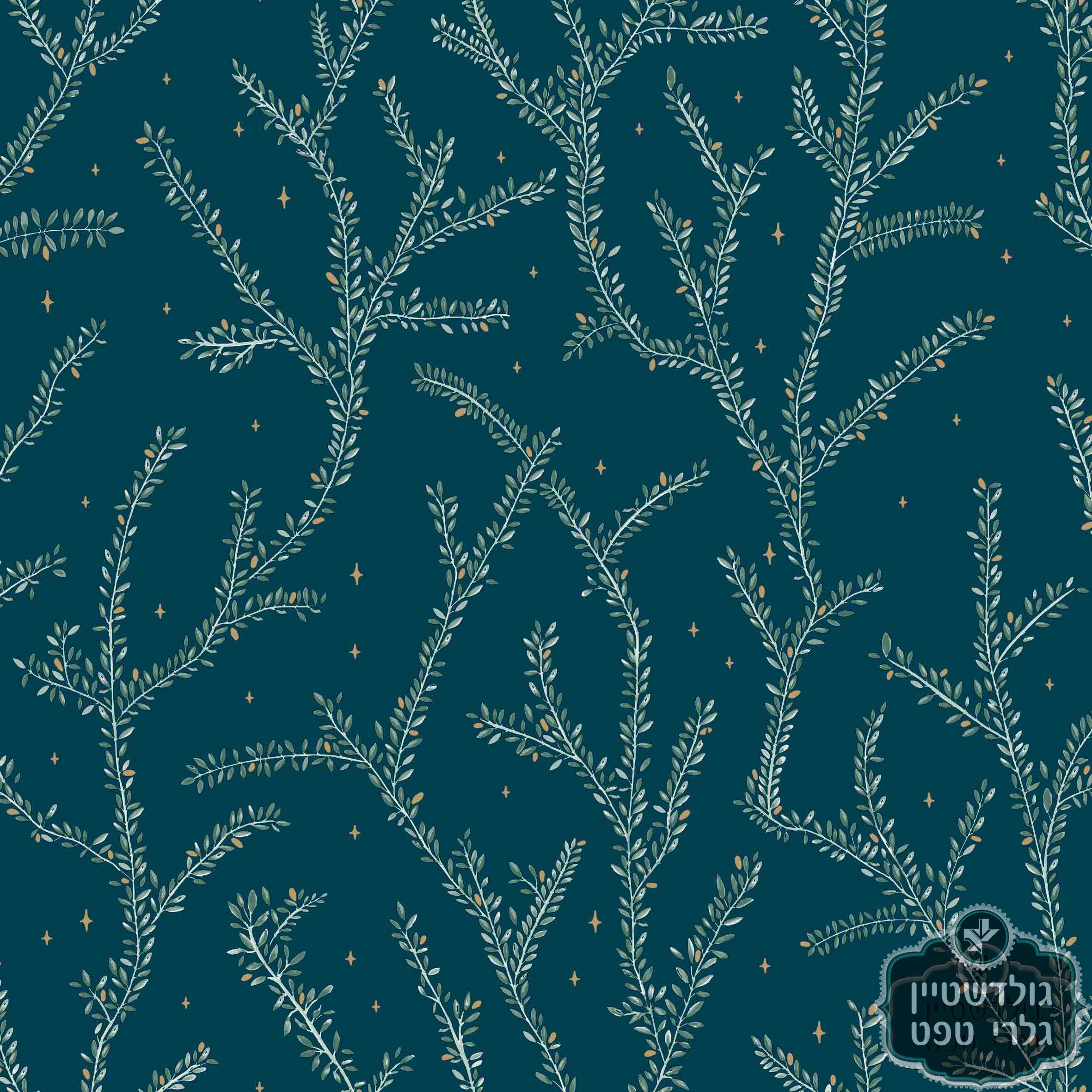 טפט עדין, ענפים ועלים, עלים וענפים ירוק, כוכבים קטנים זהב, על רקע ירוק כהה