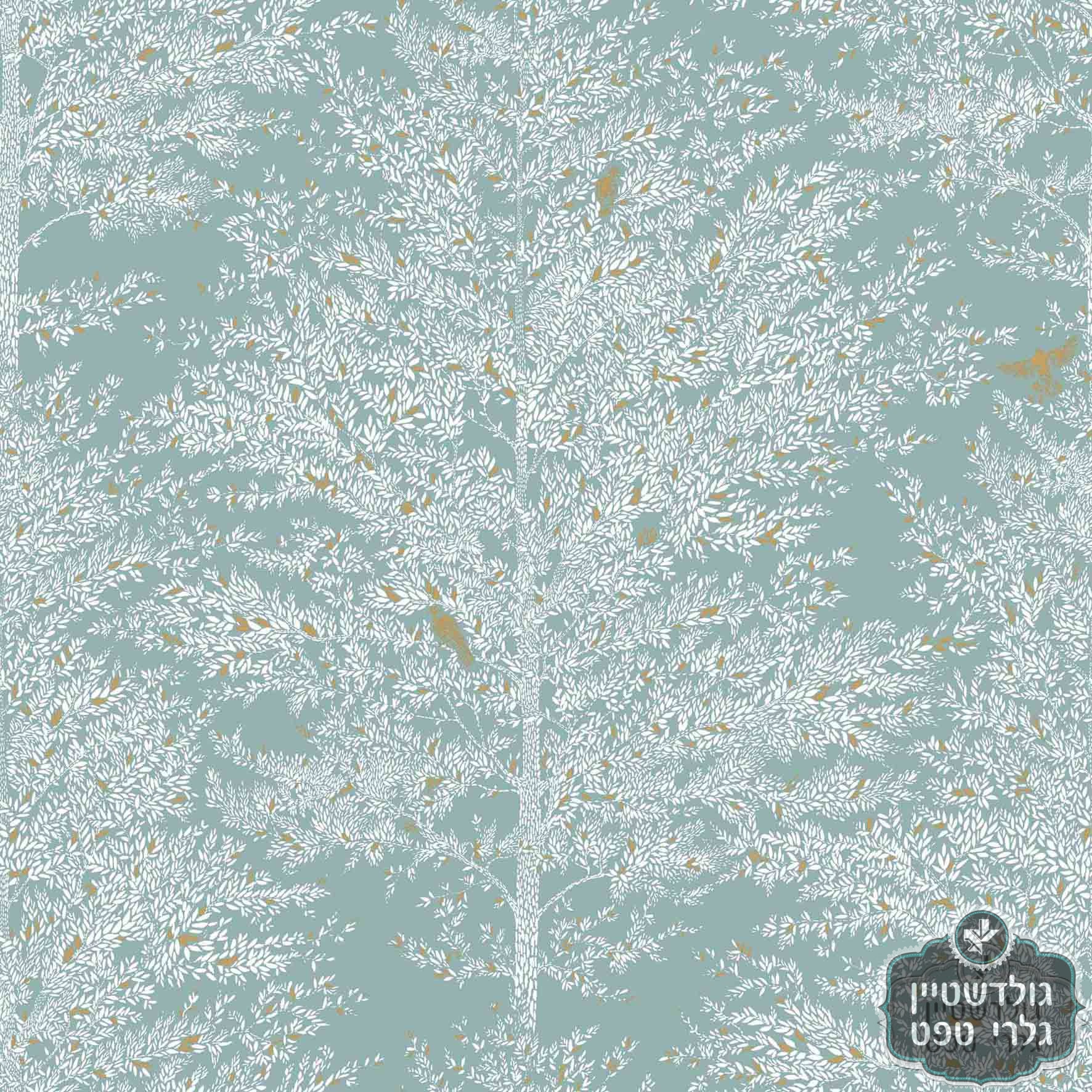 טפט עצים ביער נורדי, תכלת בן, נגיעות ציפורים ועלים בזהב