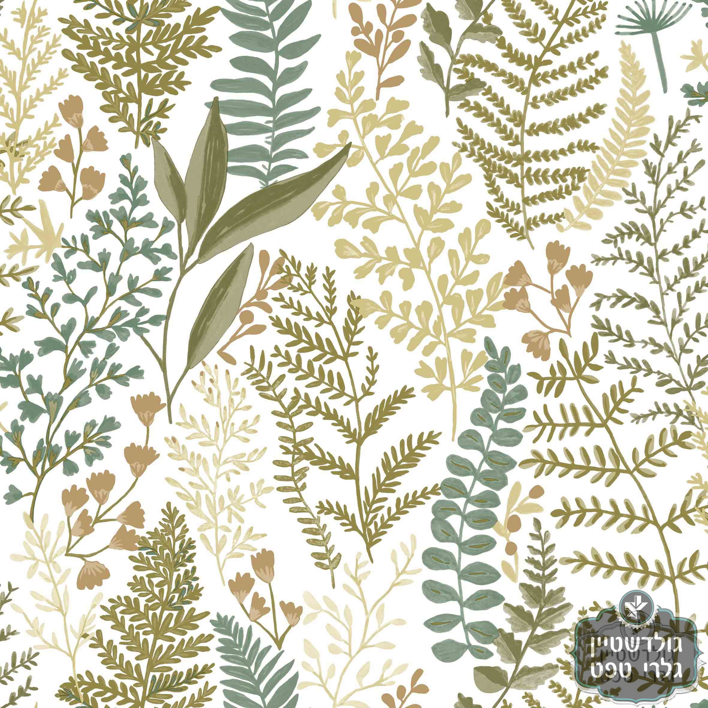 טפט ענפים ועצים פנטזי, בגווני  זית, חום, ירוק על רקע לבן
