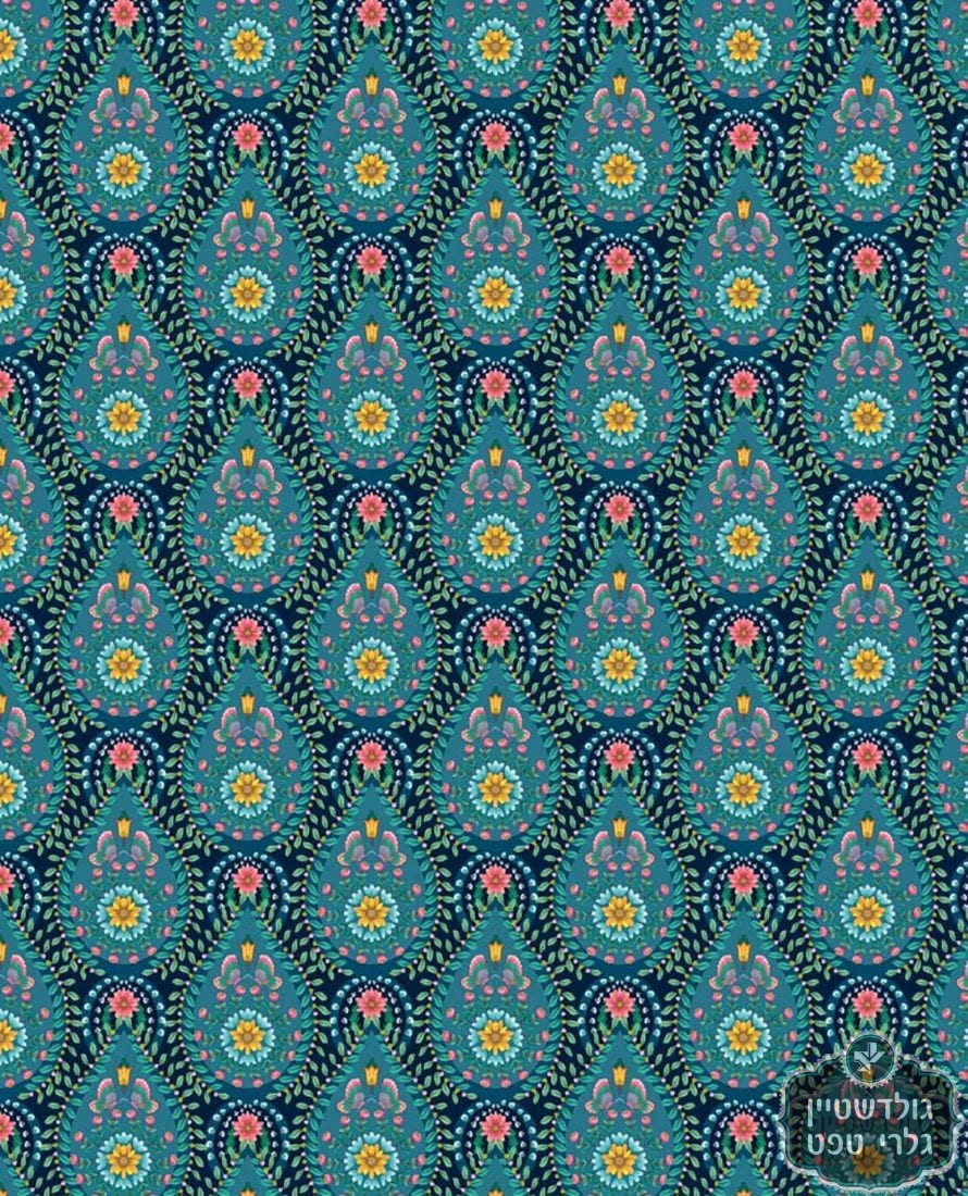 טפט טיפות גשם, פייזלי משולב עם פרחים ועלים צבעוניים, ירוק, ורוד, תכלת, טורקיז צהוב על רקע כחול כהה, ללא טקסטורה