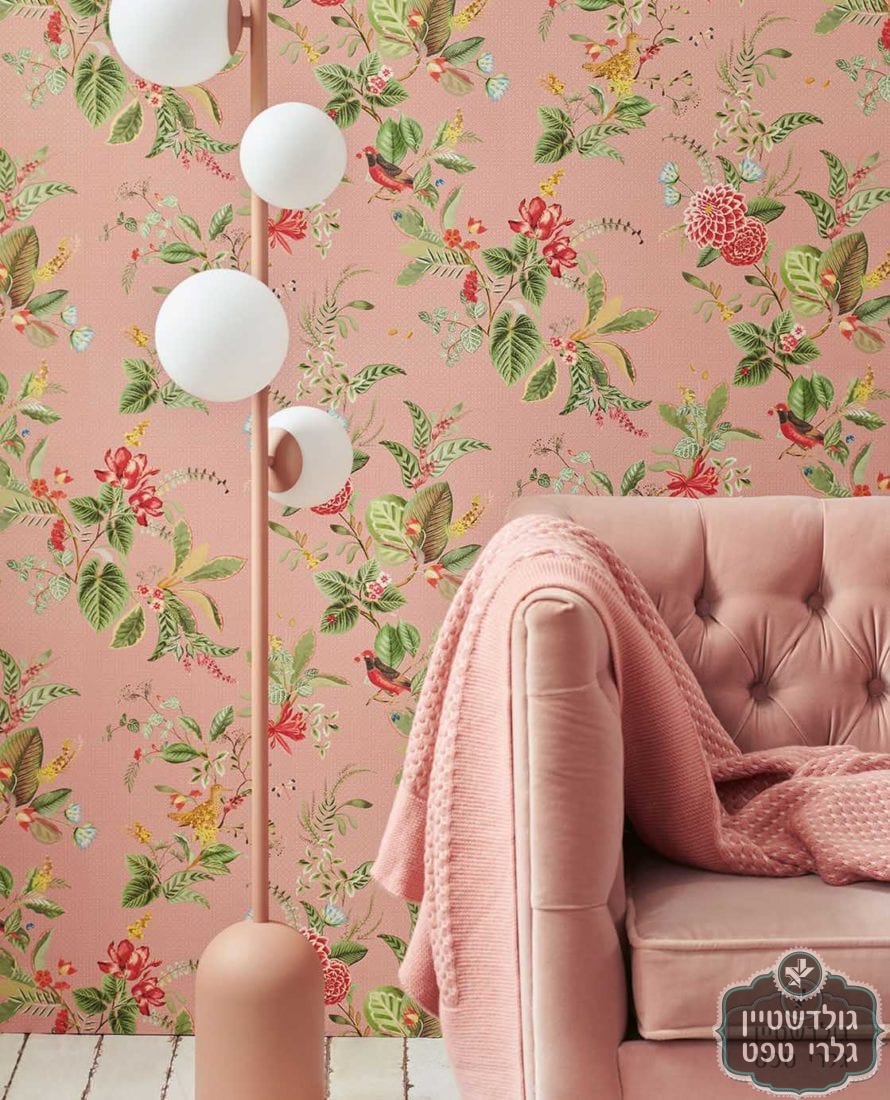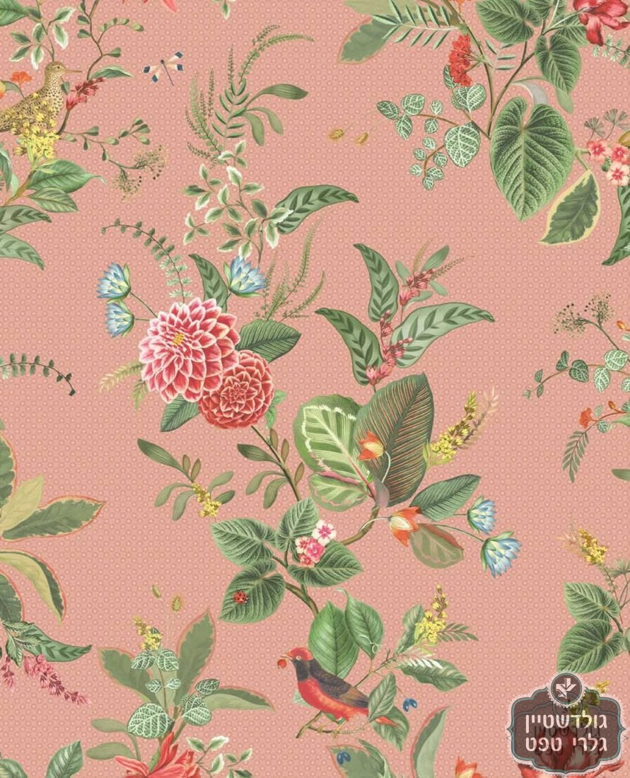 טפט פיפ פרחי פנטזיה וציפורי שיר צבעוניות על רקע ורוד עתיק