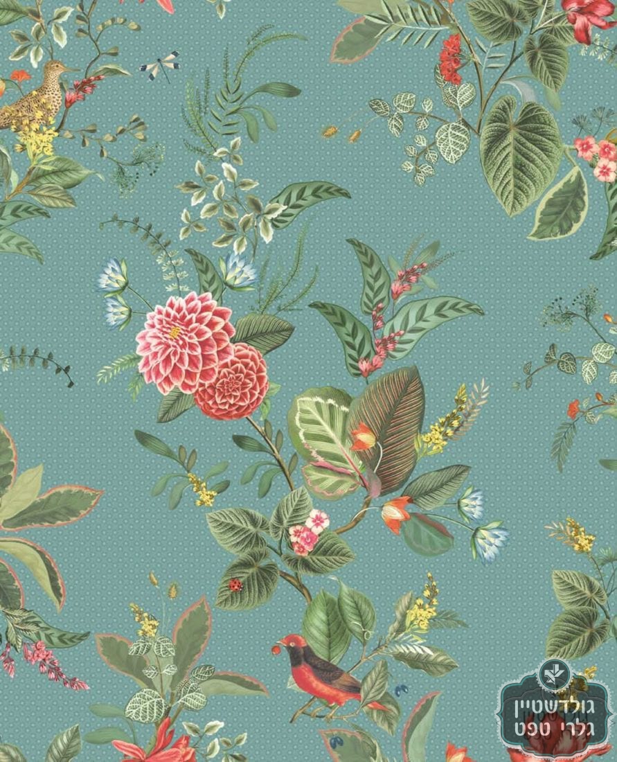 טפט פרחי פנטזיה עם ציפורי שיר צבעוניות וקסומות על רקע טקסטורה דמוי מעויינים קטנטנים ברקע, על רקע ירוק טורקיז