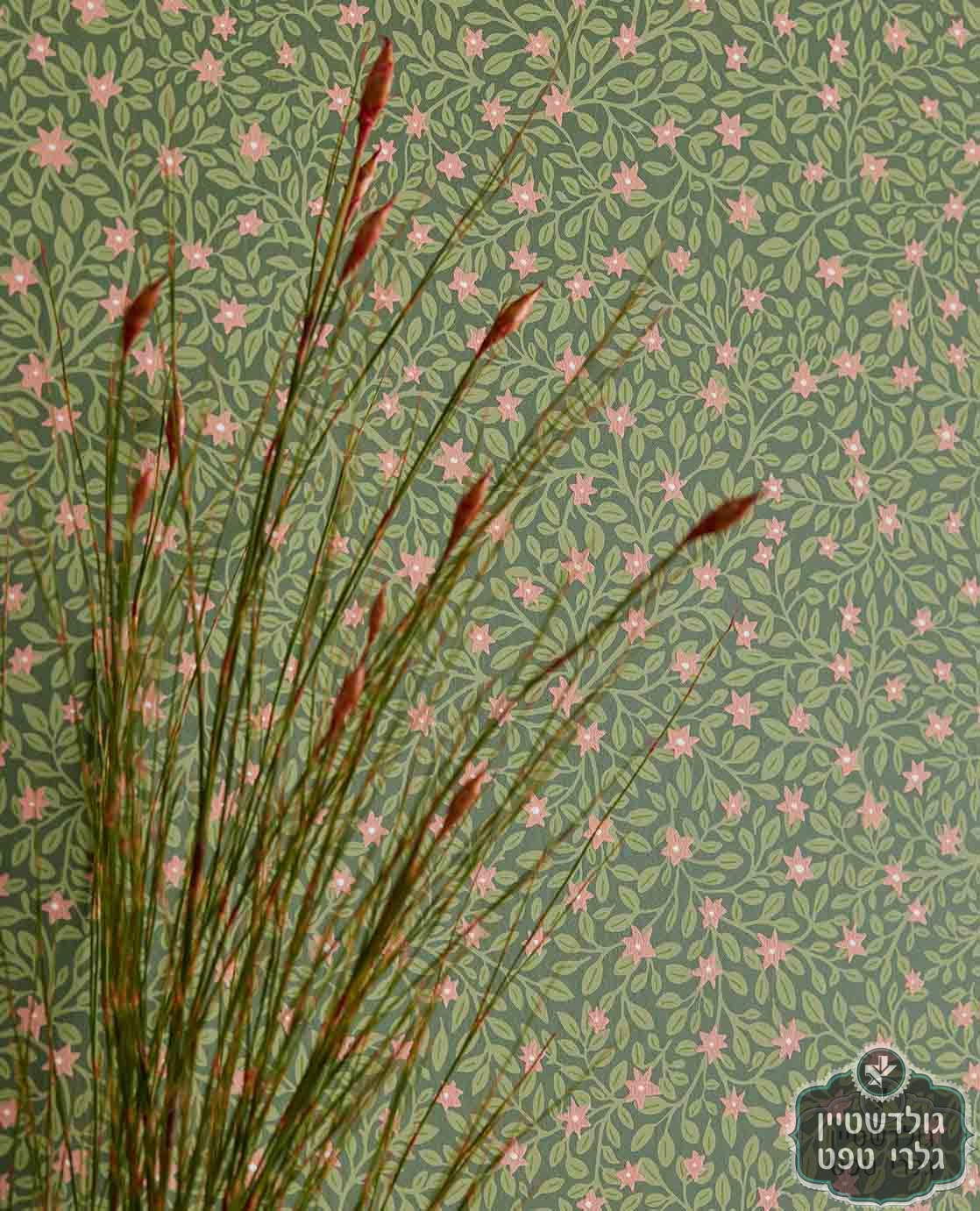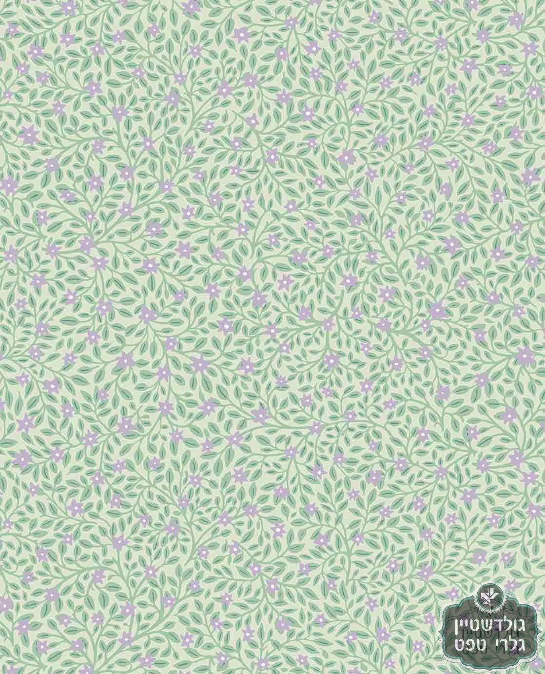 טפט פרחי כוכב קטנים, צבע סגול לילך, על רקע עלים ירוק ורקע ירקרק בהיר