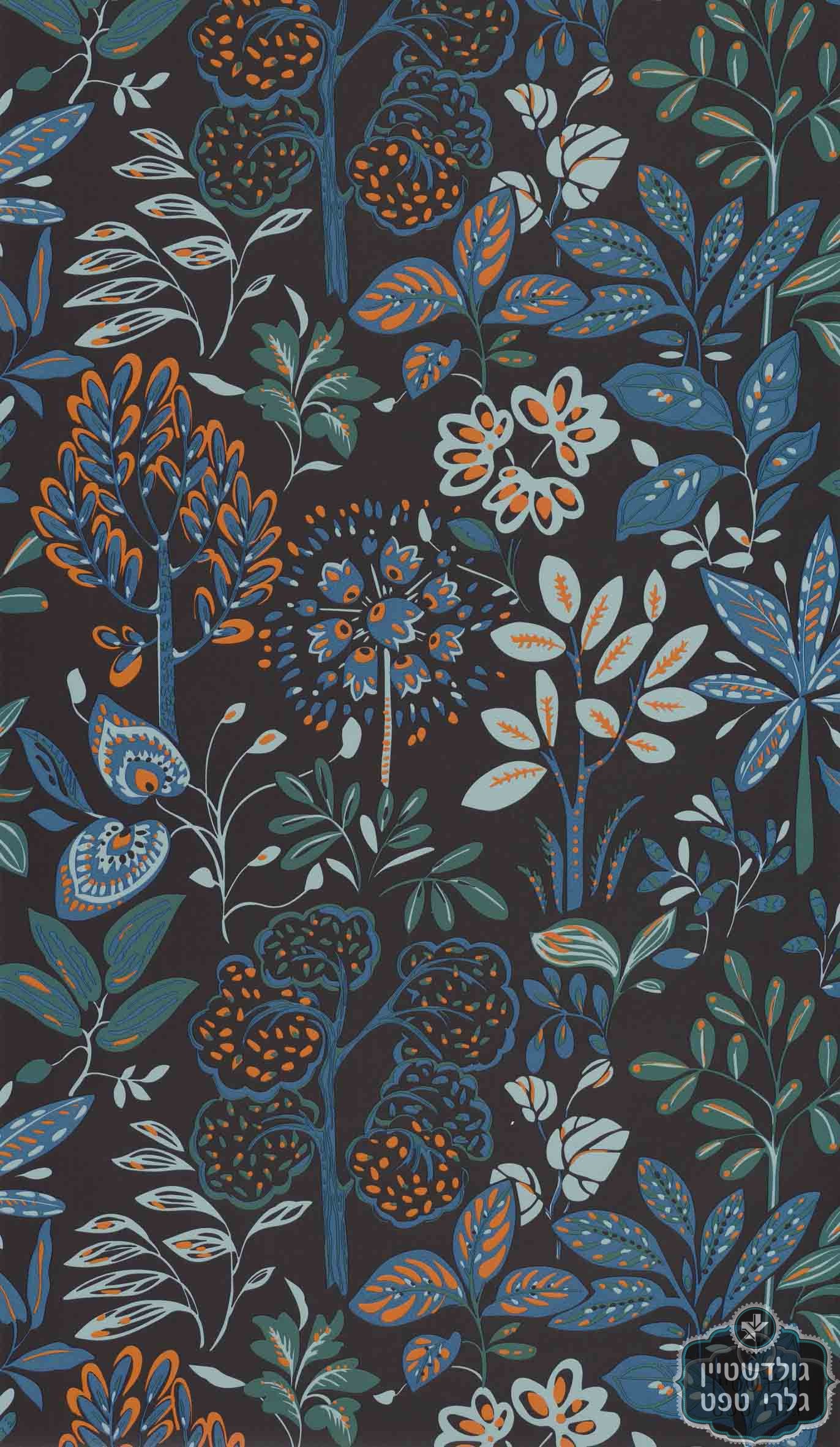 טפט פרחי לואיז, תכלת, כחול, כתום על רקע שחור