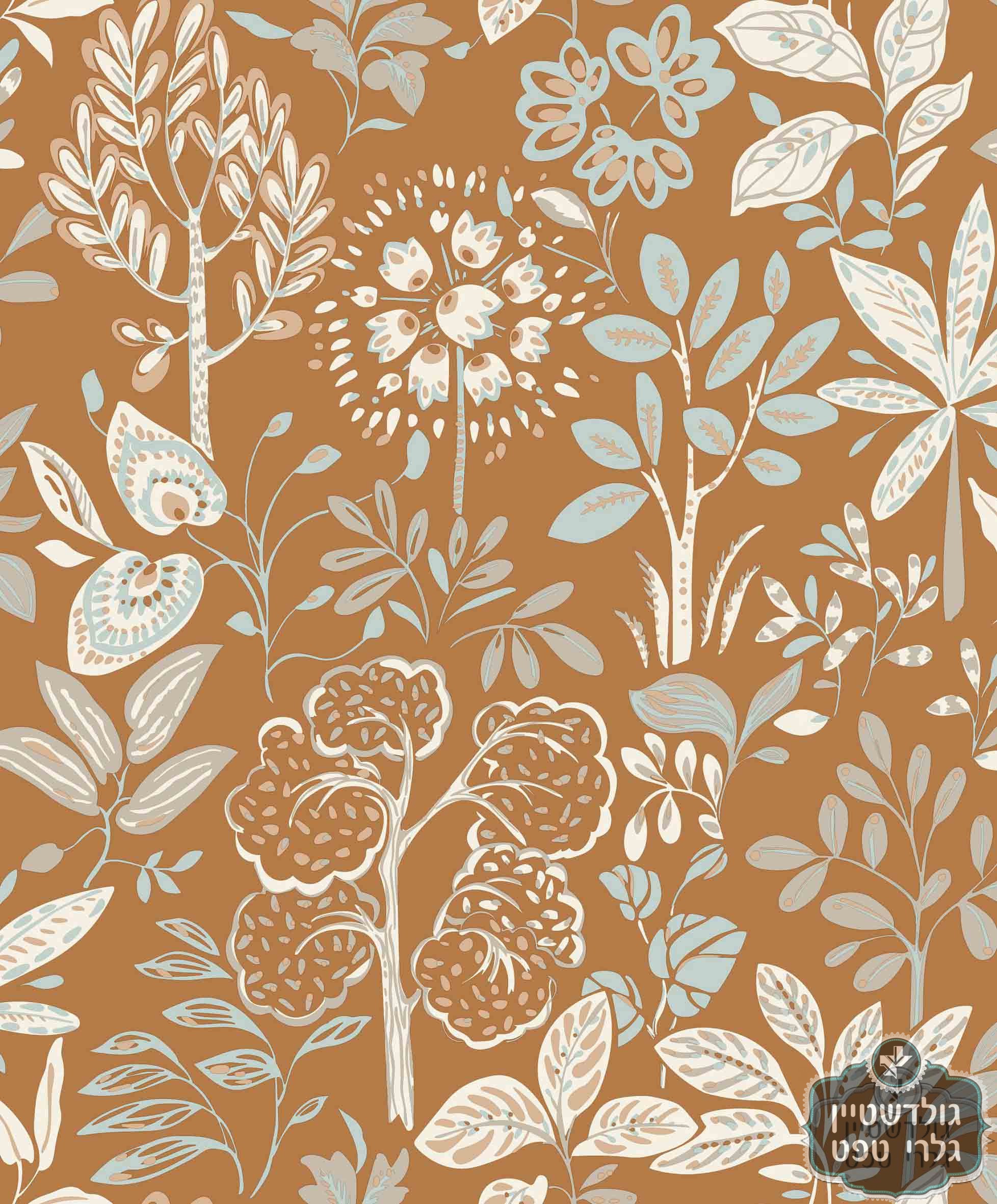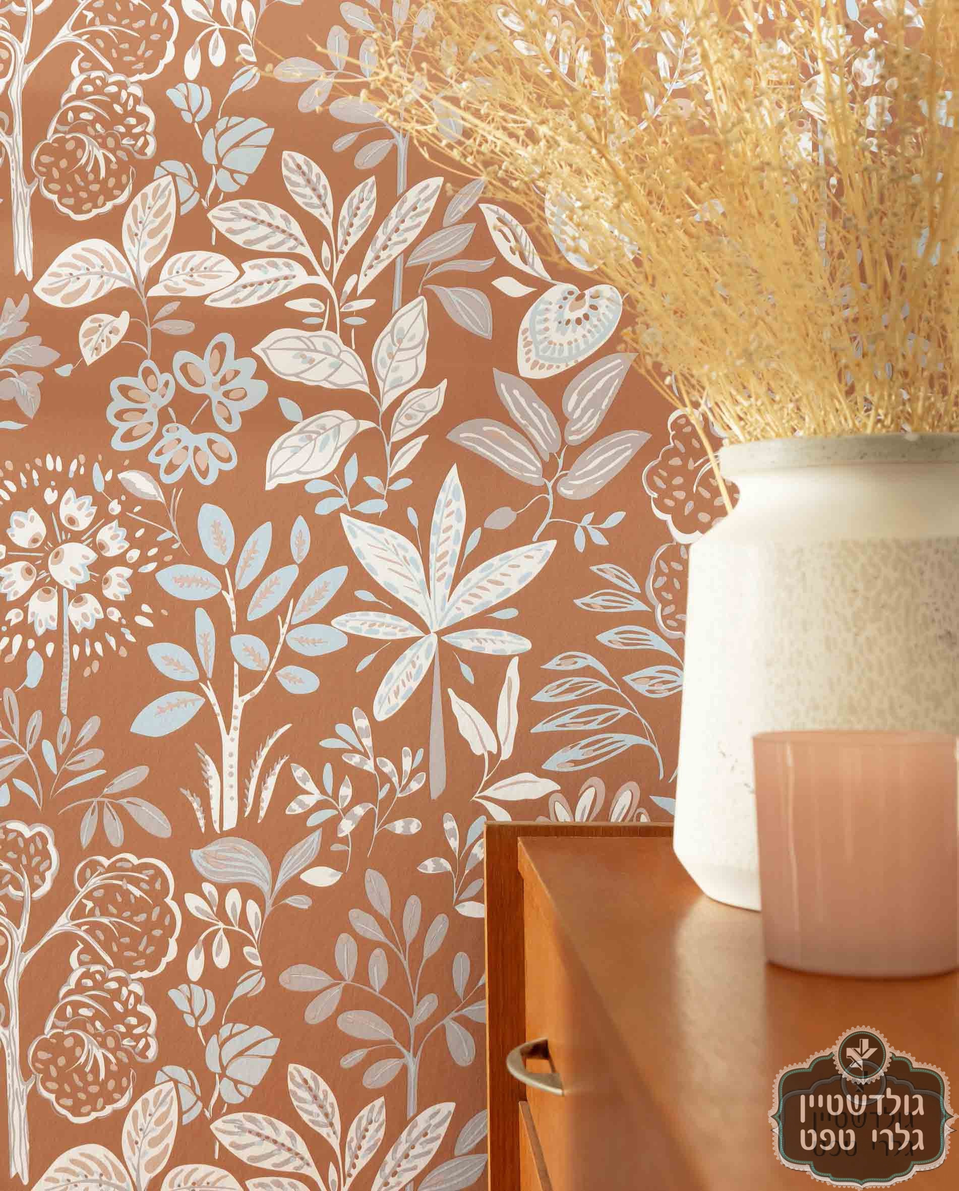 טפט פרחי לואיז, תכלת, שמנת על חום טרה קוטה, חום אדמה