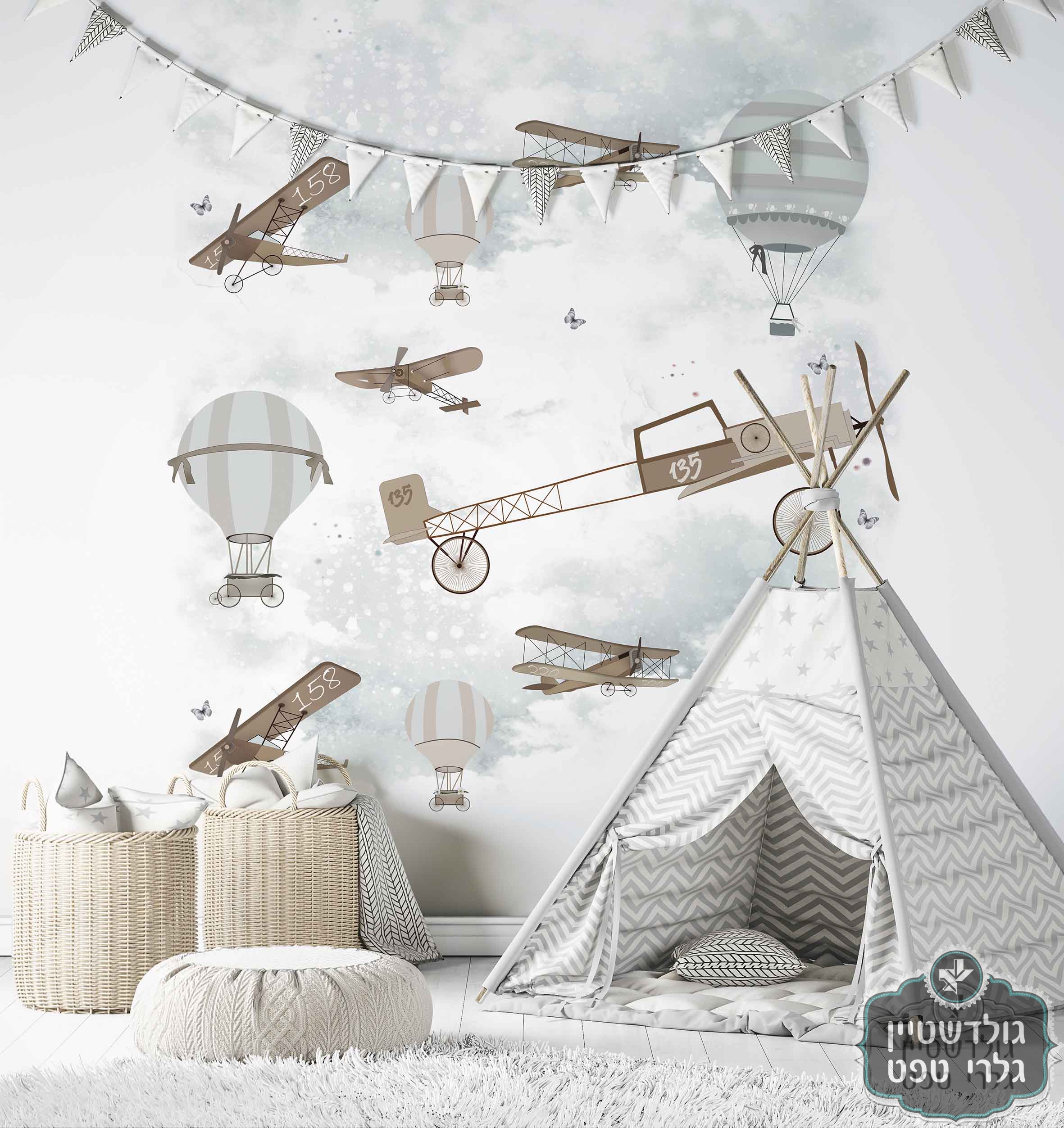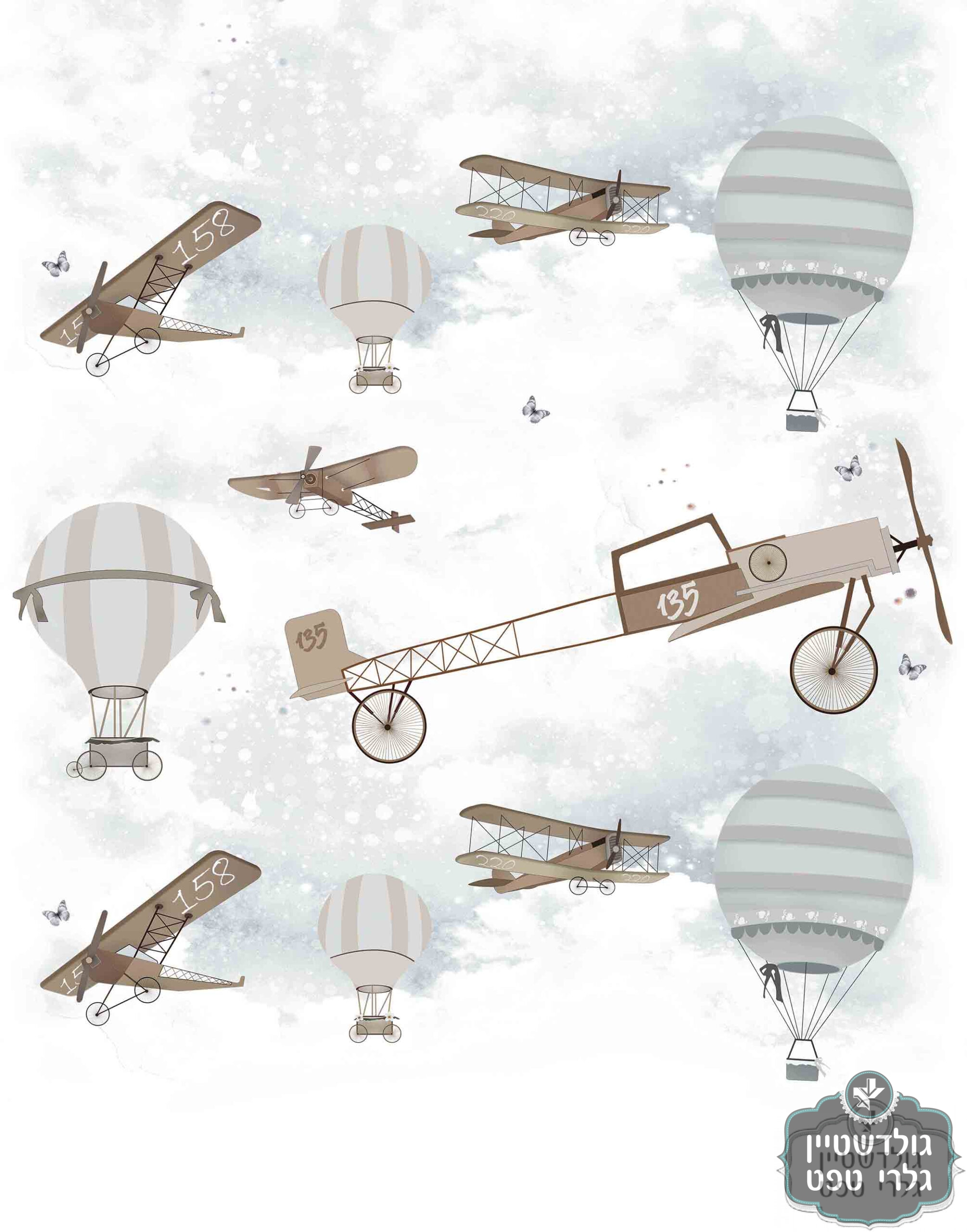 תמונת טפט עשוי ויניל, איכותי, כלי טייס, אוירון, כדור פורח, בלון פורח, עננים על רקע אפור לבן בהיר