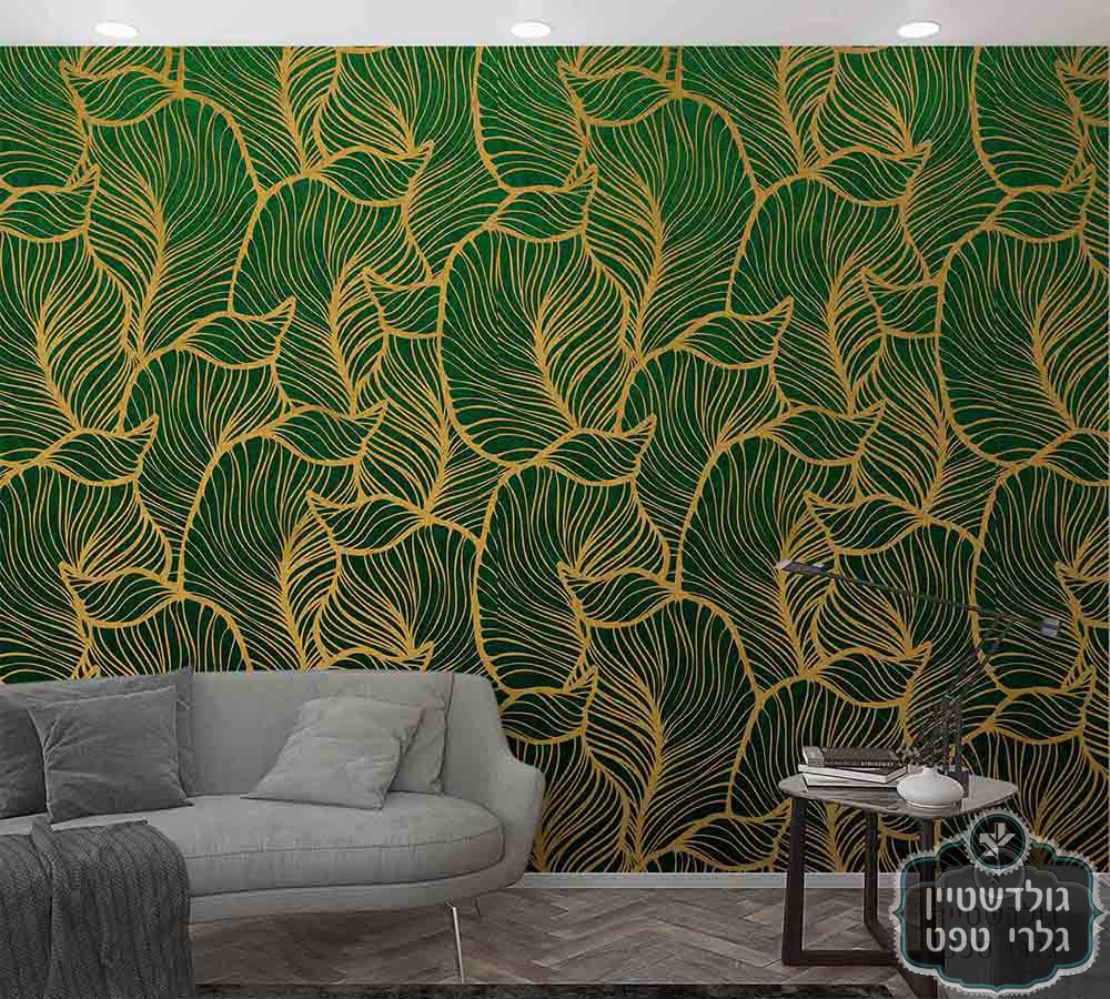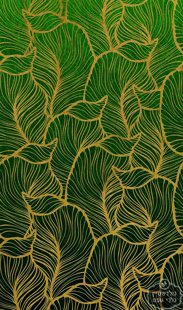 תמונת טפט עשוי ויניל, איכותי, עלי הוואי ענקיים בגווני ירוק בקבוק ואוקר – זהב