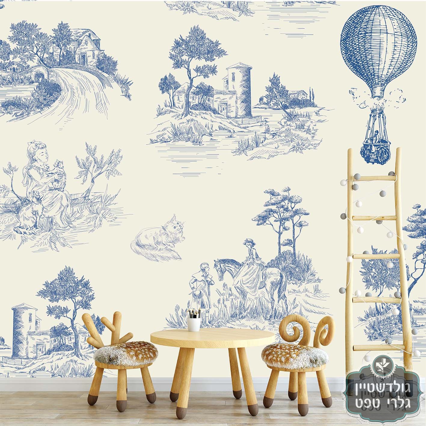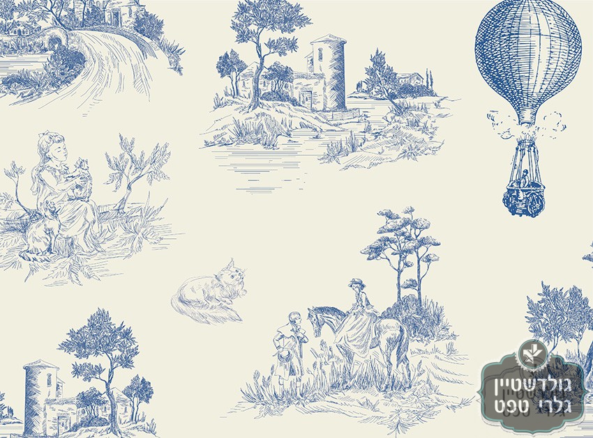 תמונת טפט, איורים עתיקים טואל, , סוסים, כדור פורח, ציורי כפר, כחול שמנת, TOILE DE JOY