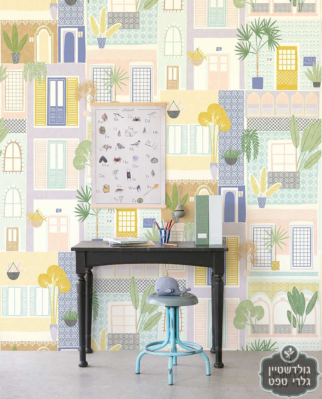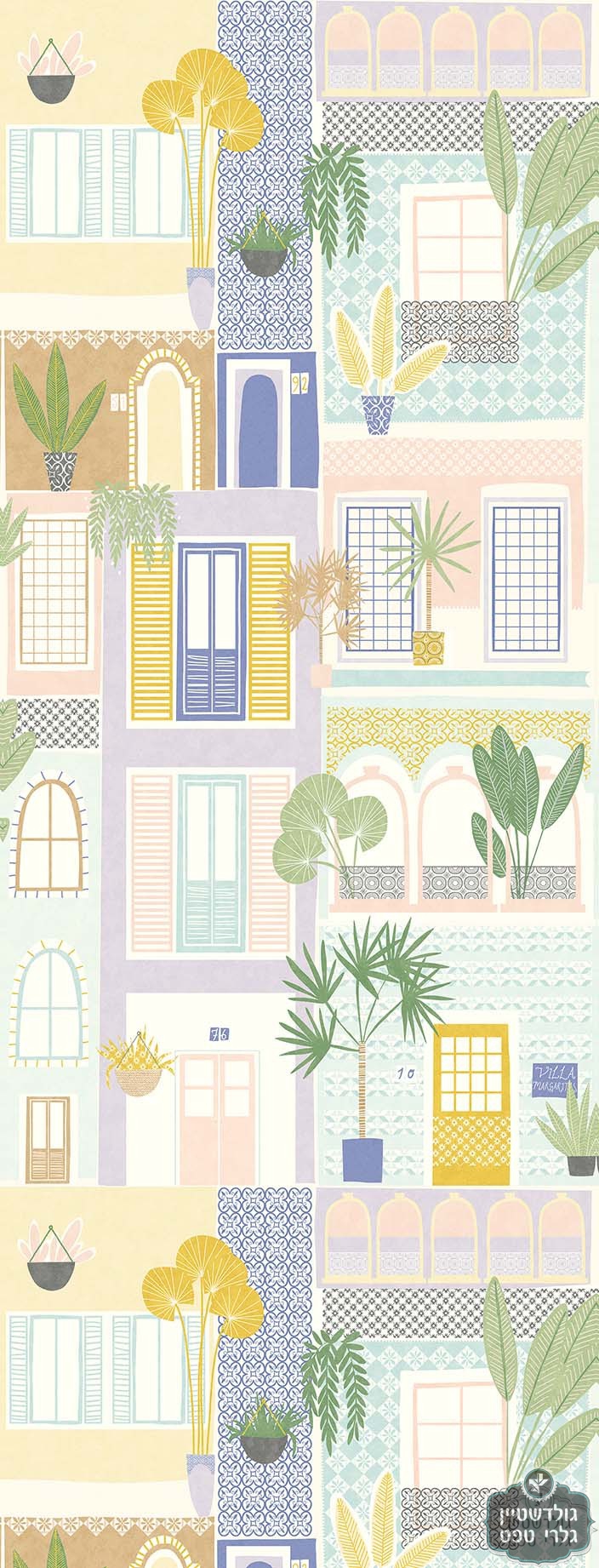 תמונת טפט, חלונות של בתים גווני פסטל, כחול, צהוב