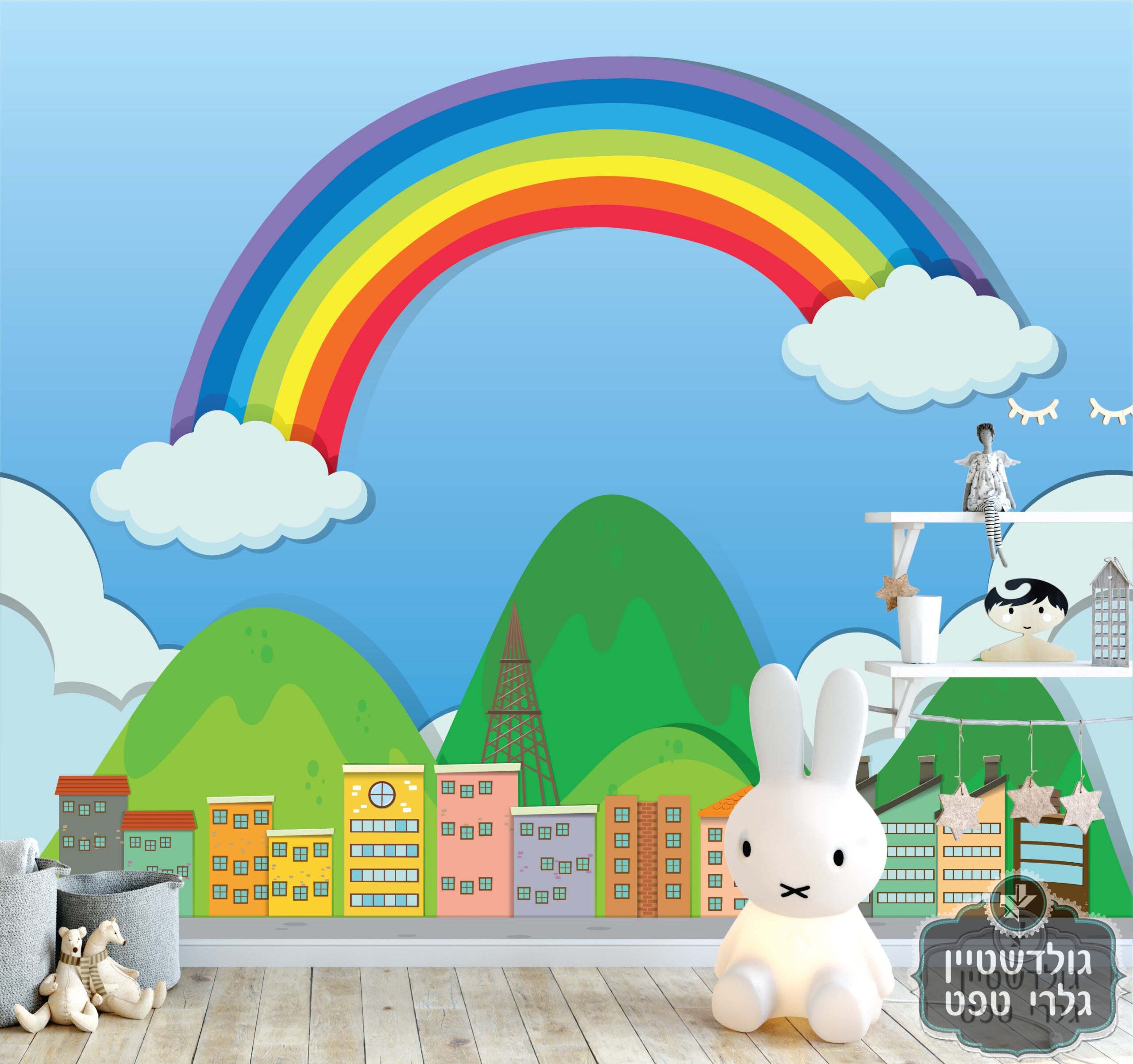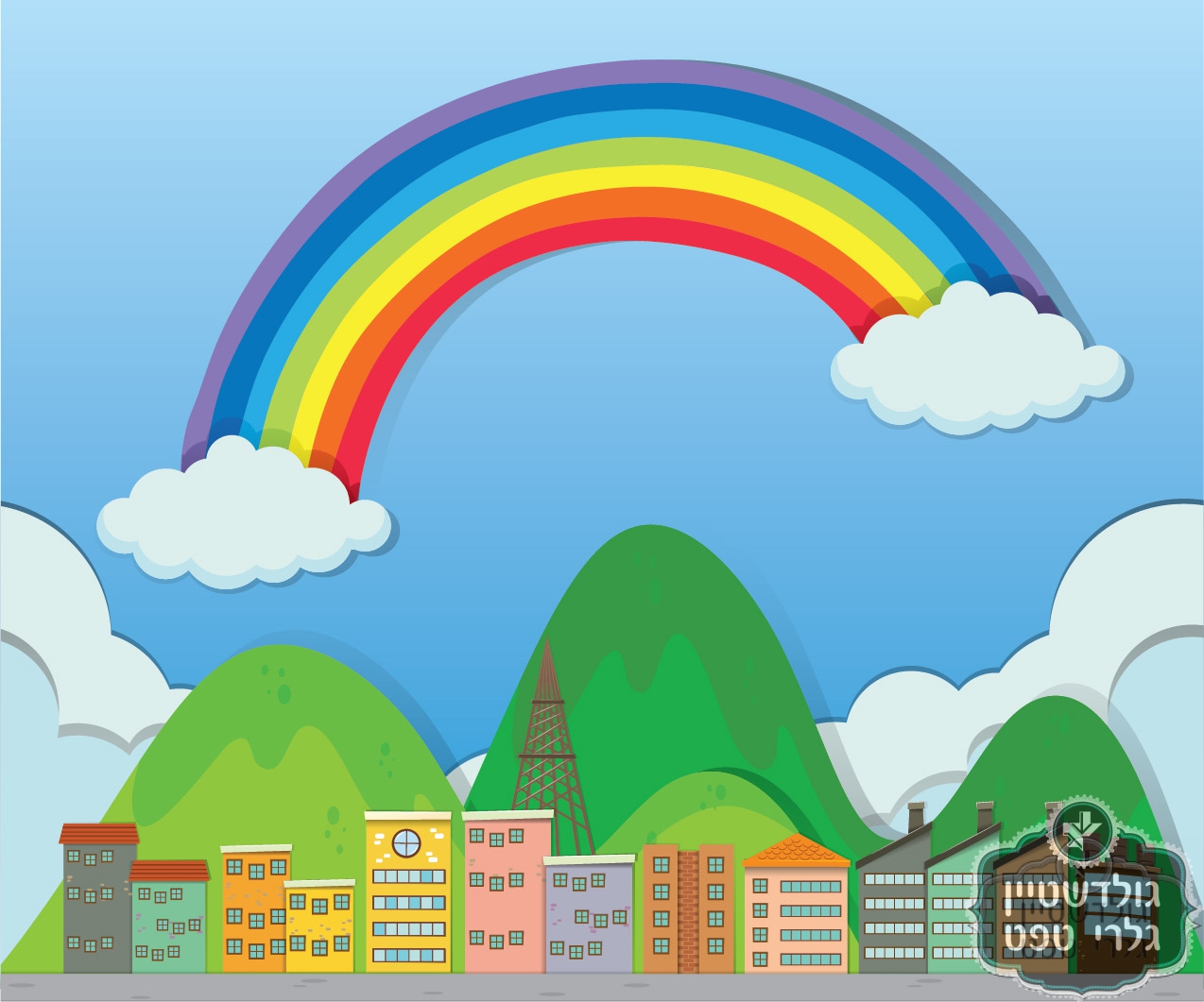 תמונת טפט, קשת צבעונית על שמיים כחולים ורקע אורבני צבעוני